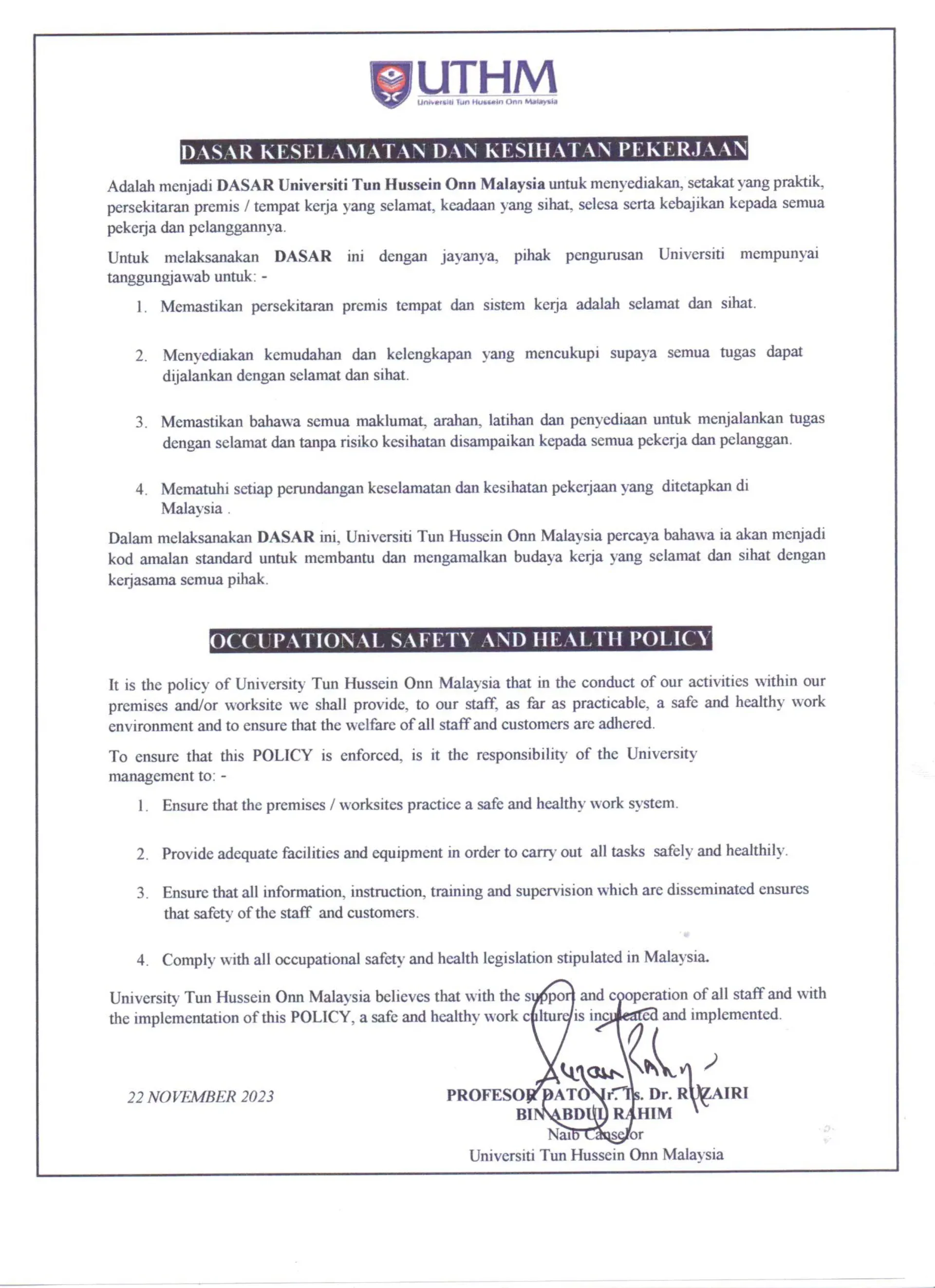 Adalah menjadi DASAR Universiti Tun Hussein Onn Malaysia untuk menyediakan, setakat yang praktik, persekitaran premis / tempat kerja yang selamat, keadaan yang sihat, selesa serta kebajikan kepada semua pekerja dan pelanggannya. Untuk melaksanakan DASAR ini dengan jayanya, pihak pengurusan mempunyai tanggungjawab untuk: